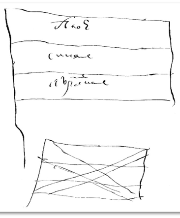 Собственноручный рисунок Петра I с указанием, какие надо делать флаги (внизу изображён трёхполосный флаг, пересечённый Андреевским крестом). 1699 год