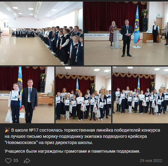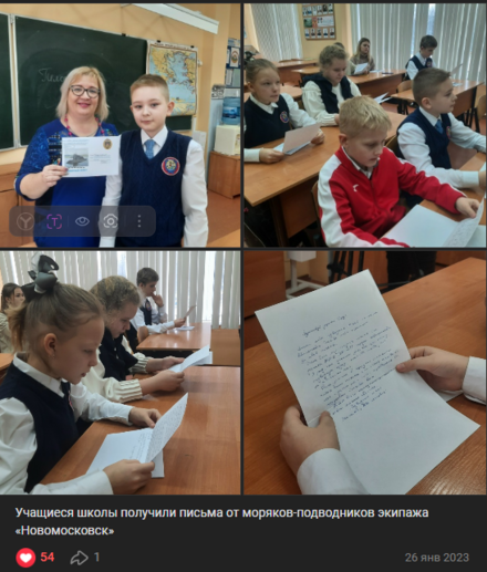27 ноября директор школы А. Н. Тарасов встретился с экипажем подводной лодки "Новомосковск" в городе Гаджиево, на базе Северного флота, где и передал морякам письма учащихся. А Чуть позднее, в январе 2023 года, все ребята получили ответные послания от покорителей морских просторов.
